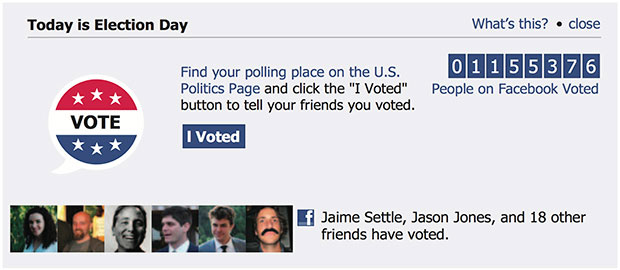 Facebook in essence said that this year it would roll out the same message to all 100 million or so subscribers in the United States. Voters could tell their friends they’d voted by clicking on a button on their Facebook page that said “I’m a Voter.”