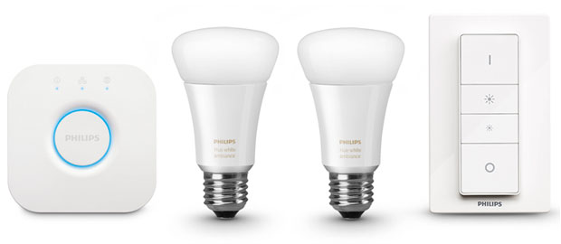 Philips Hue white ambiance lamps will be available in North America and Europe this spring as a starter kit with two bulbs (800 lumens at 4,000K), a bridge that supports Apple HomeKit, and a Philips Hue dimmer switch.